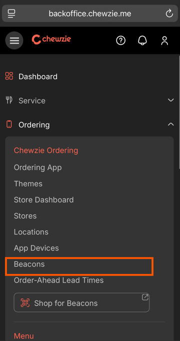 In the Chewzie Back Office, navigate to 'Ordering / Beacons'. Note that this works best on a mobile device as the phone's camera is used to scan the beacon.