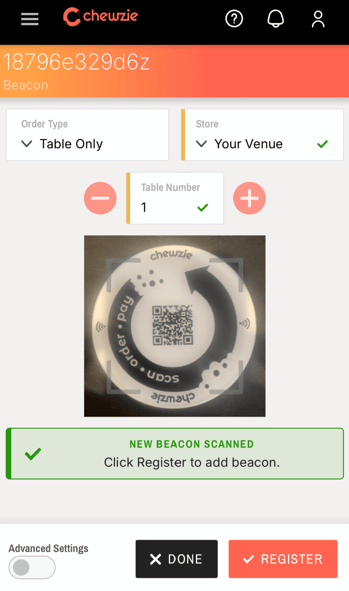 Step 5. Click 'Register'. The beacon will be saved and the table number will be incremented ready to scan the next beacon.